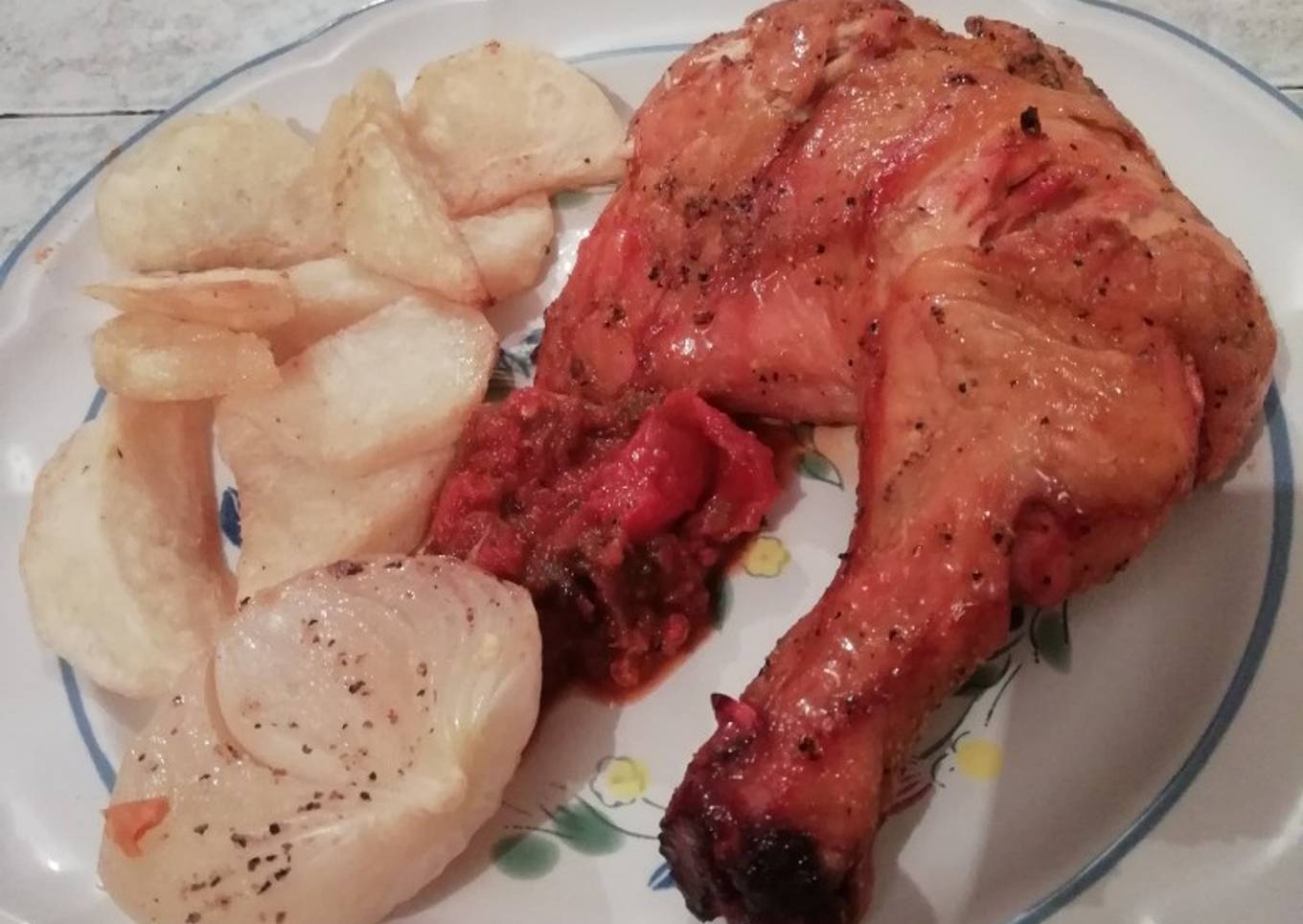 - Y lo vamos a meter al horno a 180 grados por dos horas o hasta que el pollo se vea doradito. Yo partí cebollas y les puse de la preparación de mostaza y las envolví en aluminio para que se cocieran junto al pollo