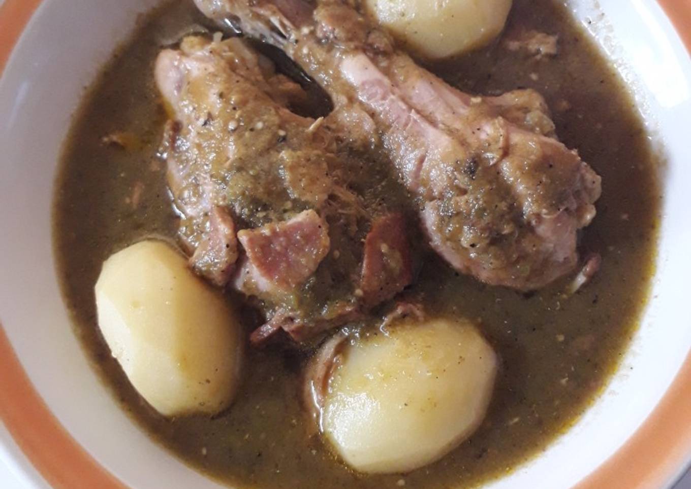 Pollo en salsa, con papitas y tocino