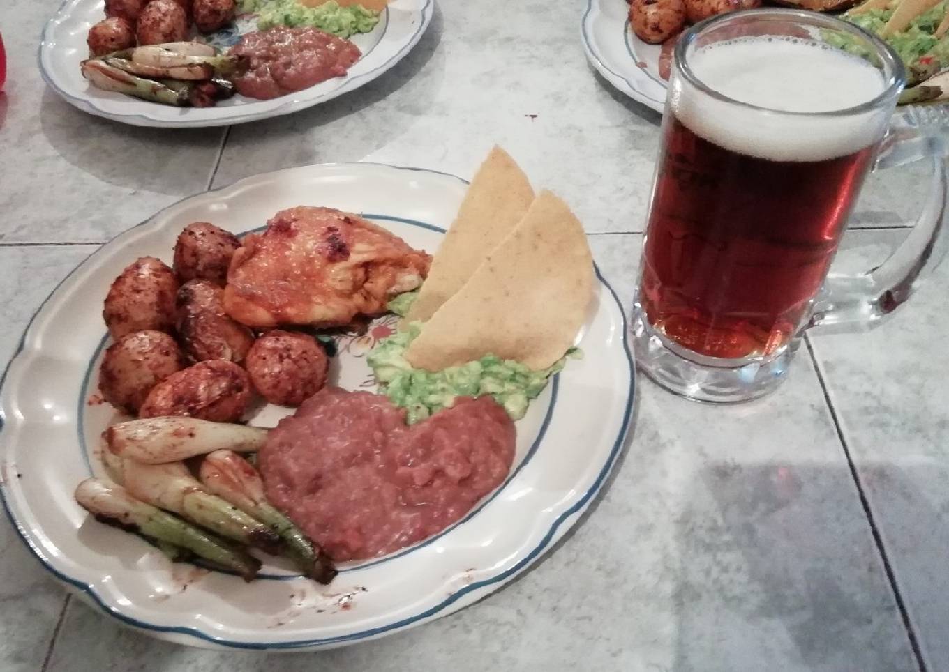 - Calentar 1lt de aceite con 1/4 de manteca, cuando este muy caliente poner a freír el pollo hasta que quede dorado. Servir con guacamole y frijoles refritos, cebollas cambray y papas dragón y listo una comida gourmet. Y no puede falta una rica cerveza bien fría 🍺