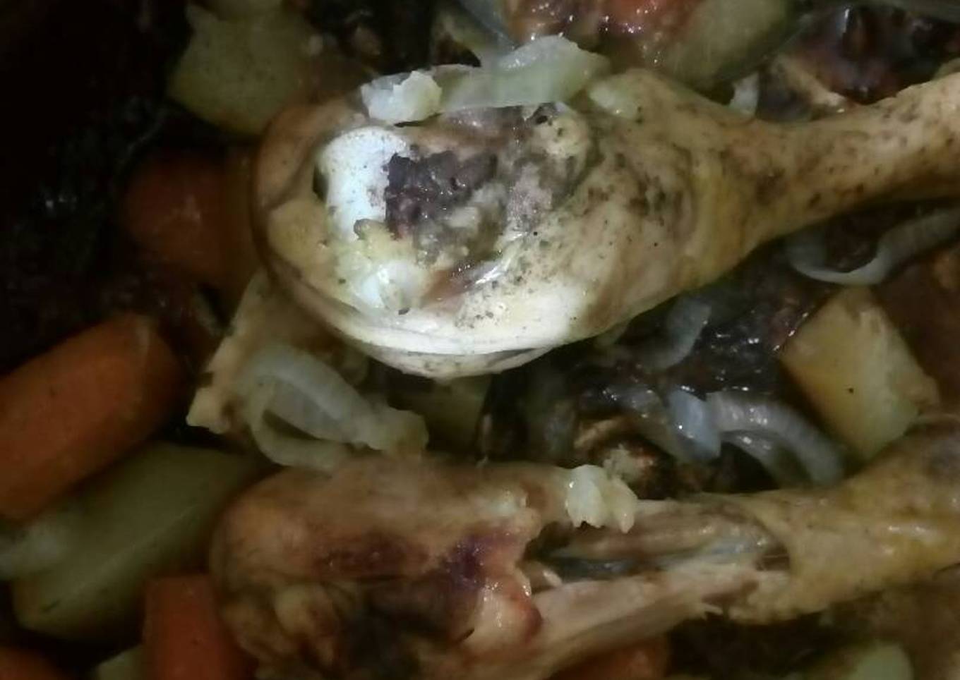 - Poner el pollo, ajo, cebolla, con las papas y zanahorias cortadas en trozos grandes