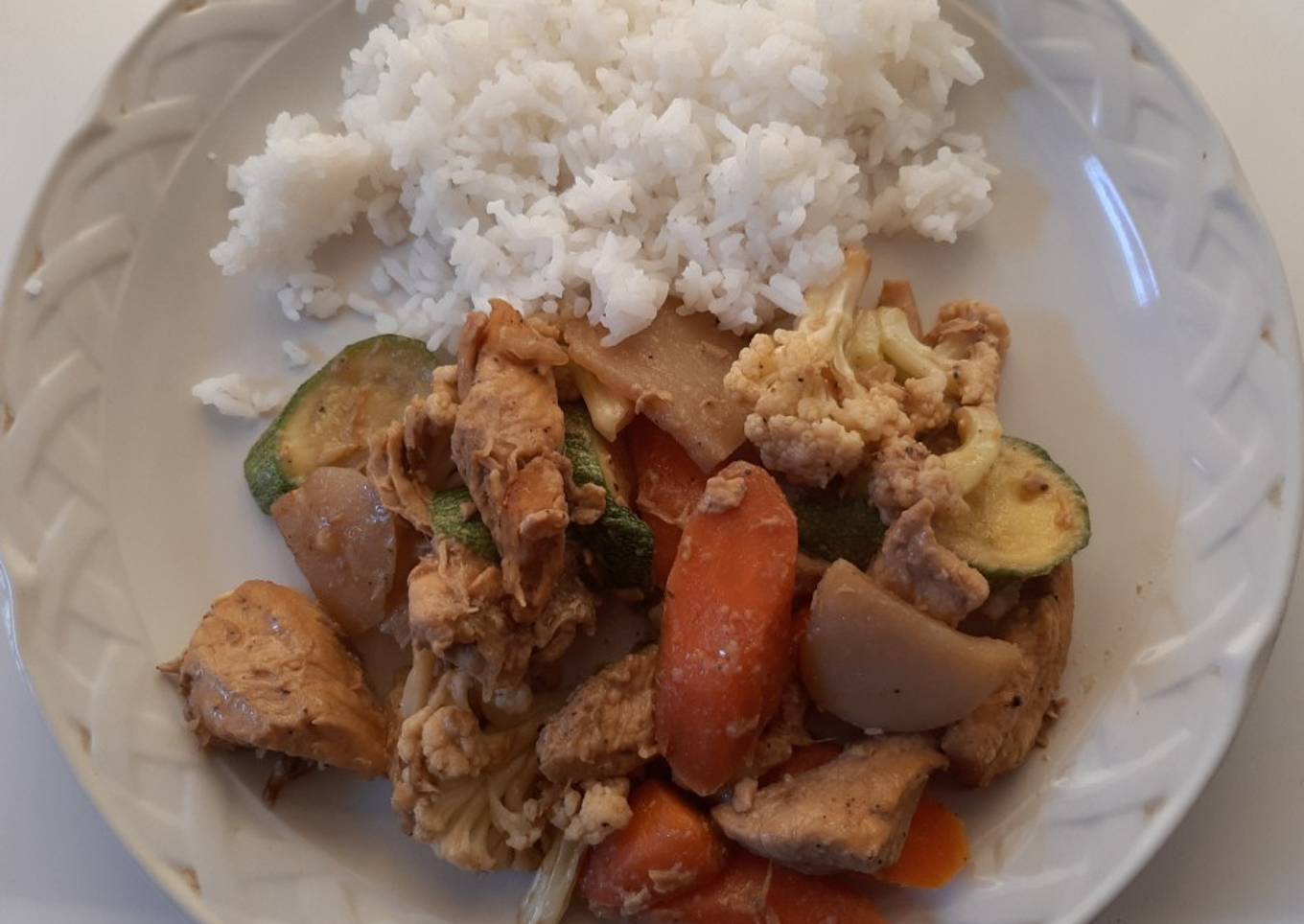 - Agrega papa, zanahoria, coliflor, deja fuego bajo y tapado, unos 10 minutos, agrega calabacita, agrega un poco de salsa de soya, deja 5 minutos y listo un arroz a vapor de va perfecto,