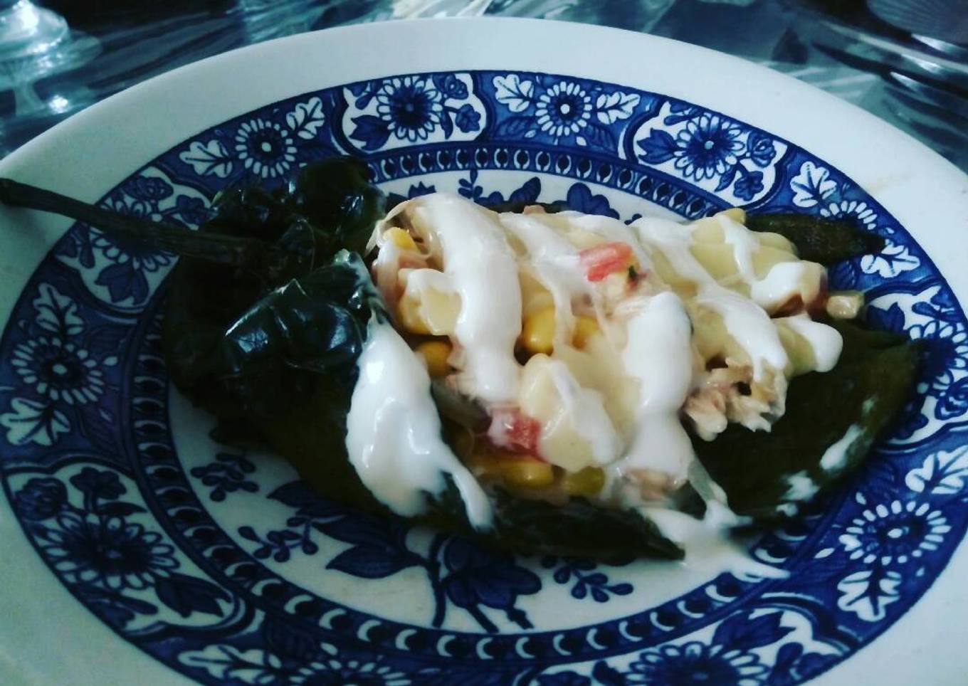 - Rellenar los chiles con lo anterior, agregar el queso, se puede hornear por 10 min o en un sartén para fundir el queso a fuego lento...