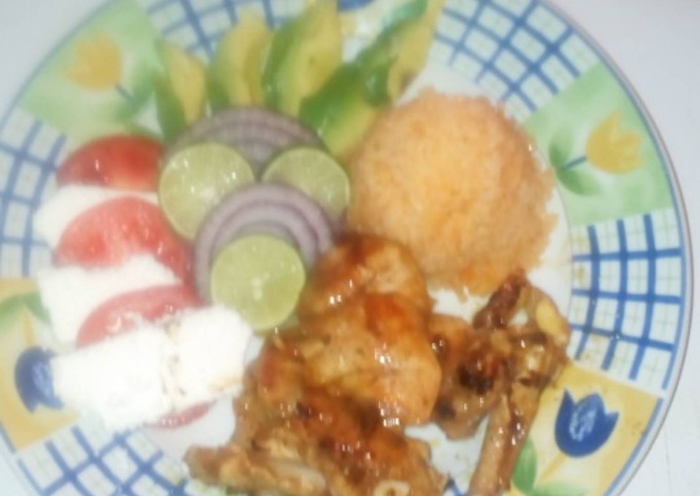 - Se ponen a la parrilla los muslos o a la plancha y se comienza a montar la ensalada el aguacate, jitomate y las demás guarniciones en un plato extendido tal cual se mira en la foto, se moldea el arroz una vez ya cocido y listo, es importante cocer muy bien el pollo en el grill o en la plancha
